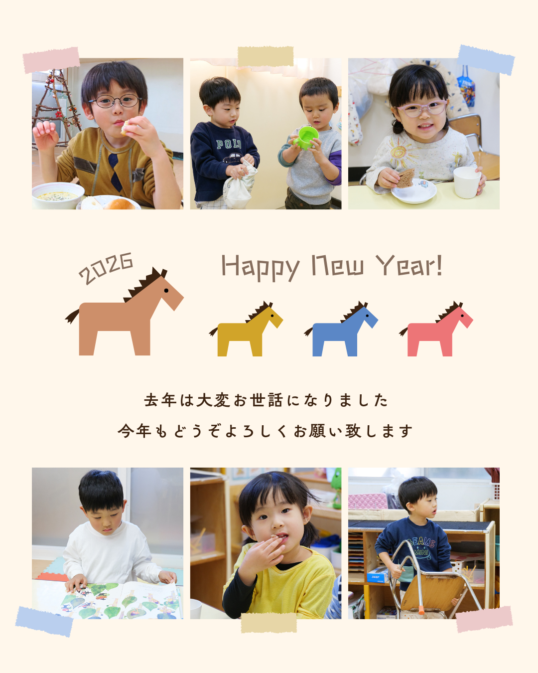 入園式、進級式、クラス懇談会、こどもの日、七夕集会、夏祭り、水遊び、お楽しみ保育、運動会、ハロウィン、親子遠足、勤労感謝の日(地域交流)、クリスマス会、生活発表会、節分集会、ひな祭り、お別れ遠足、卒園式 など