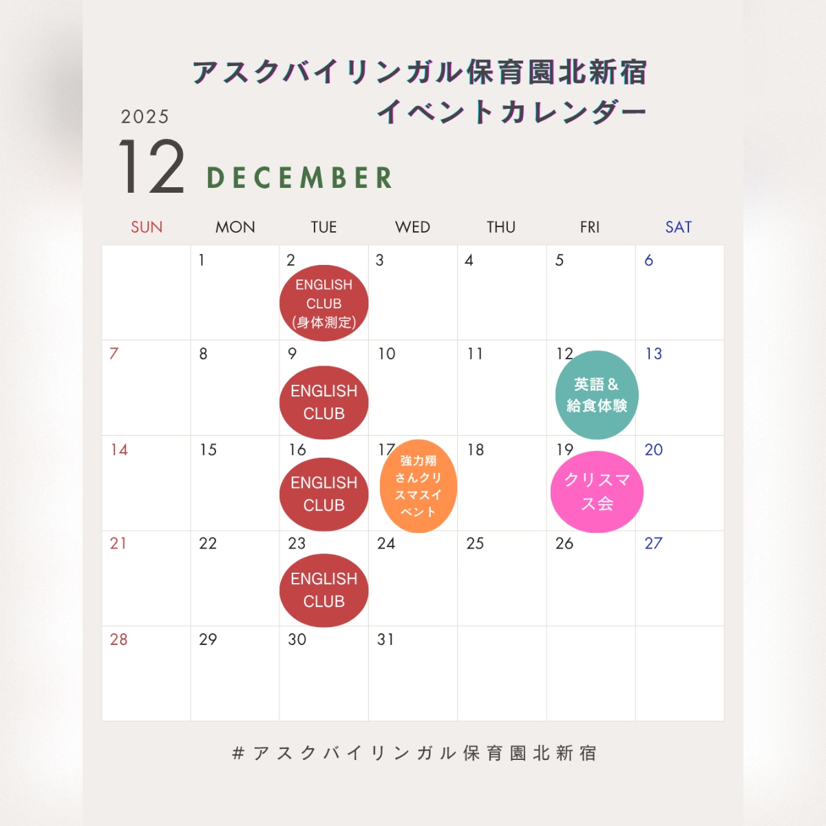 入園式、進級式、クラス懇談会、こどもの日、七夕集会、夏祭り、水遊び、お楽しみ保育、運動会、ハロウィン、親子遠足、勤労感謝の日(地域交流)、クリスマス会、生活発表会、節分集会、ひな祭り、お別れ遠足、卒園式 など
