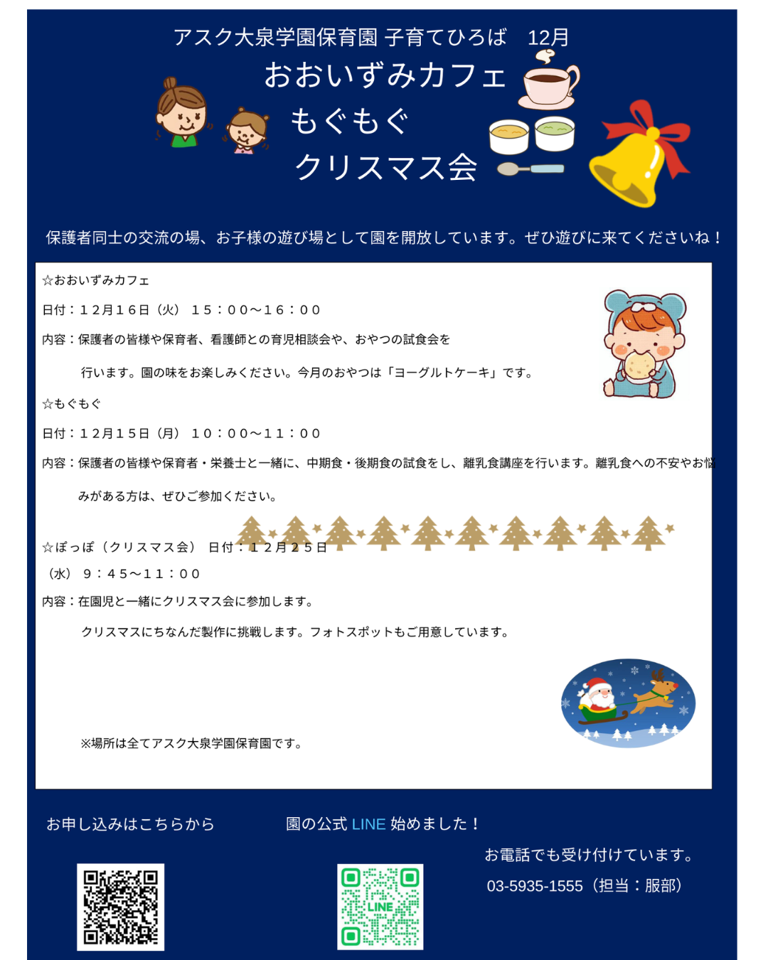 入園式、進級式、クラス懇談会、こどもの日、七夕集会、夏祭り、水遊び、お楽しみ保育、運動会、ハロウィン、親子遠足、勤労感謝の日(地域交流)、クリスマス会、生活発表会、節分集会、ひな祭り、お別れ遠足、卒園式 など