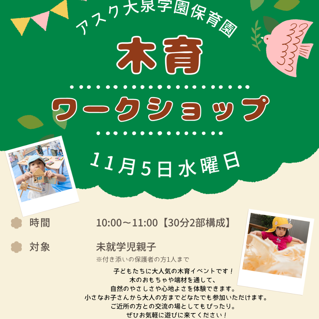 入園式、進級式、クラス懇談会、こどもの日、七夕集会、夏祭り、水遊び、お楽しみ保育、運動会、ハロウィン、親子遠足、勤労感謝の日(地域交流)、クリスマス会、生活発表会、節分集会、ひな祭り、お別れ遠足、卒園式 など