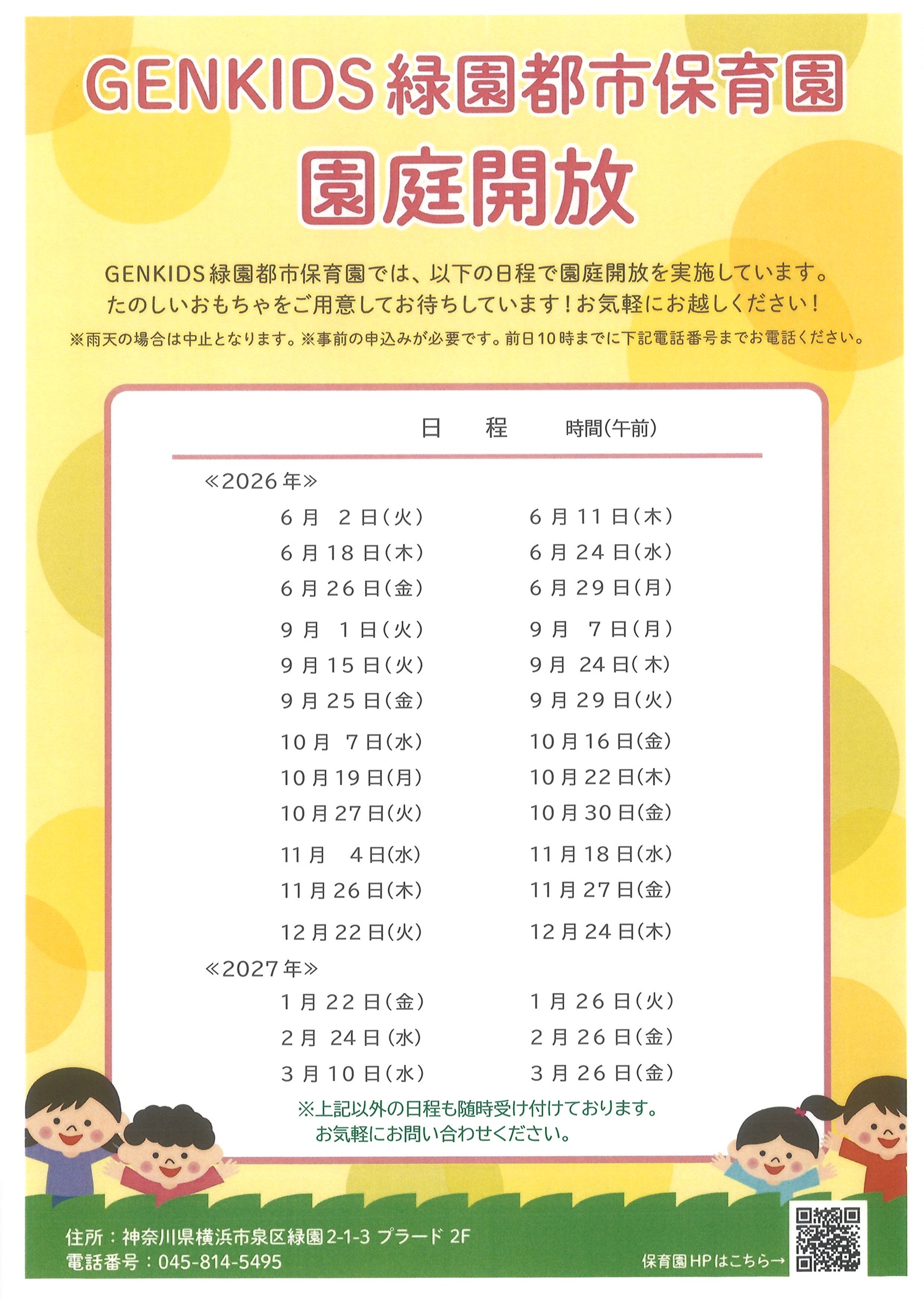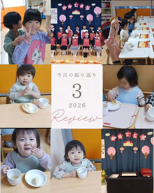 入園式、進級式、クラス懇談会、こどもの日、七夕集会、夏祭り、水遊び、お楽しみ保育、運動会、ハロウィン、親子遠足、勤労感謝の日(地域交流)、クリスマス会、生活発表会、節分集会、ひな祭り、お別れ遠足、卒園式 など