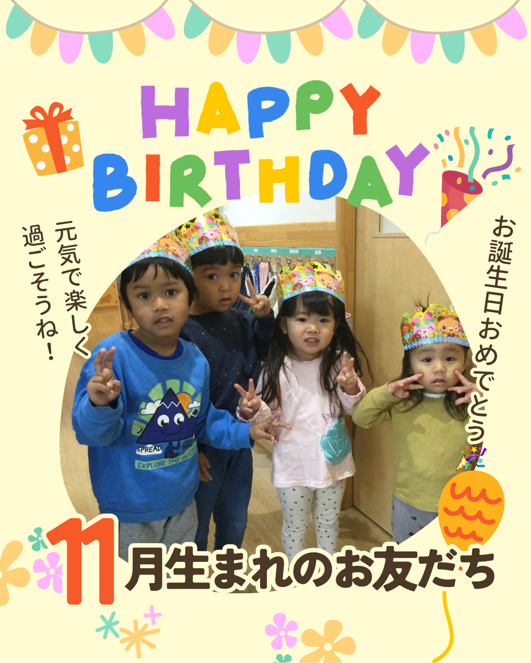 入園式、進級式、クラス懇談会、こどもの日、七夕集会、夏祭り、水遊び、お楽しみ保育、運動会、ハロウィン、親子遠足、勤労感謝の日(地域交流)、クリスマス会、生活発表会、節分集会、ひな祭り、お別れ遠足、卒園式 など